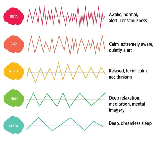 - Alpha Waves(8- 14 HZ) are associated with relaxation, you don’t feel stressed anymore, yet you are still awake, focused, and experiencing a lot of mental activities. It’s like going home at the end of the day after finishing work and sitting down relaxed, watching TV, or engaging in activities that relax the mind and body as meditation. A Blog in Psychology Today proposes that “Neuroscientists made a correlation between an increase of alpha brain waves through “ mindfulness” and “meditation” and the possibility to significantly reduce feelings of depression and develop creative thinking skills for the long-term.
